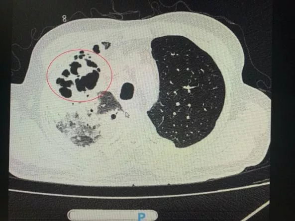 番禺院区呼吸内科何梦璋主任接诊后,对钟叔进行详细检查。此时,钟叔的病情已经十分危急,由于不能自主呼吸,他带上了无创呼吸机辅助呼吸治疗。看到钟叔胸片时,医护人员头皮也一阵发麻,胸部CT可见双肺多发的炎症浸润、双肺多发空洞。通俗来说,钟叔的肺部已经被病原体蚕食,啃出无数个大小各异的洞!可怕的是,这种病变对肺功能的破坏是永久性、不可恢复的。根据钟叔病史以及胸部CT结果,最终诊断为“吸入性肺脓肿”。