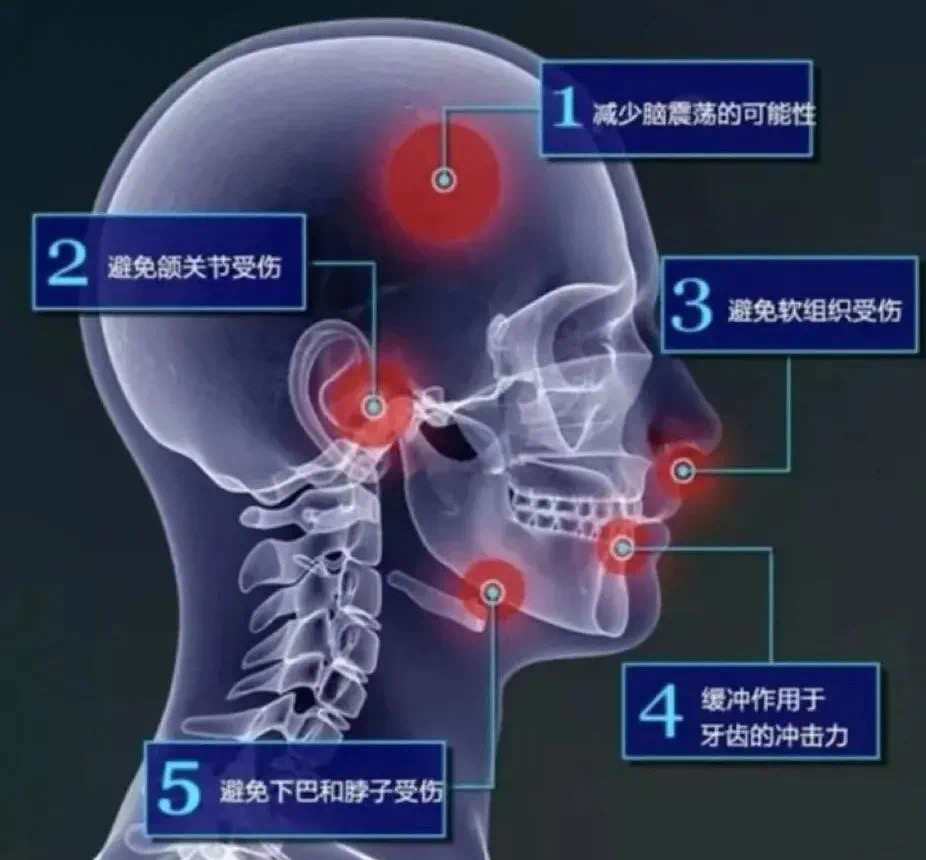 在面部、下颚受到撞击时,软质的护齿能够吸收力量并重新分配压力,尽量避免嘴唇和牙齿撞击造成牙齿损伤,同时齿面是弧形,也能有效减轻对舌头的伤害、避免运动员咬伤自己,缓冲运动冲击力,也保护了下巴和颈部。