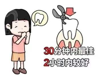 30分钟内看牙医。牙齿发生意外时,要第一时间去看牙医,才更有可能将牙齿保留。