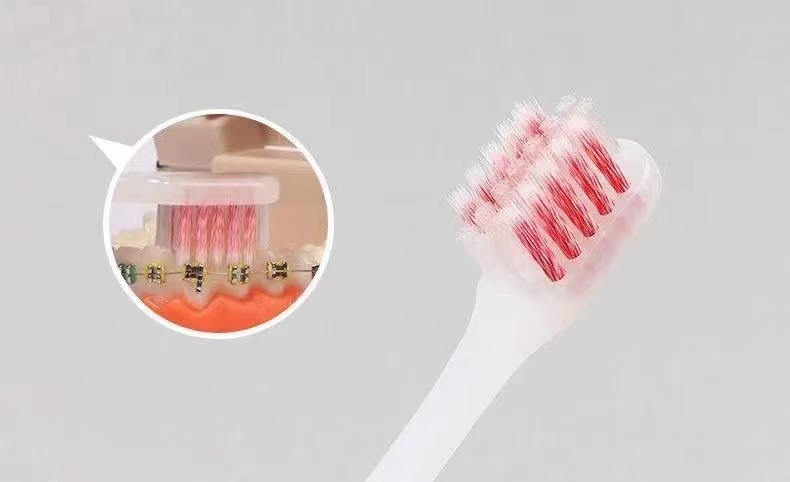 佩戴钢丝托槽进行矫正时,建议使用正畸的U型或V型牙刷,能够避开托槽贴合牙齿,更好的清洁牙面上的残留物。