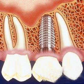 将种植体缓缓地放在已经备好的种植窝内部,并且用特制的工具来夹紧,这样就会使得种植体顶圆和鼓面是相平的,种植钉和牙槽骨紧密迎合之后,安装烤瓷牙冠之后就完成了整个的手术过程。