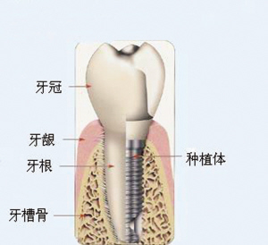 种植牙(口腔医学术语为“种植义齿”)是由牙种植体及其支持的上部结构组成的修复体构成。牙种植体又称人工牙根,是用人工材料(如金属、陶瓷等)制成,以手术方法植入缺牙区颌骨内。经过一段时间,人工牙根会与周围骨组织发生骨结合,然后再利用该人工牙根作为支持,在人工牙根上通过一些特殊的连接装置与上部结构相连。上部结构又称上部假牙,在结构上与活动假牙或固定假牙类似。通过与人工牙根的连接,可以从人工牙根获得固位和支持,以此修复缺失的牙。