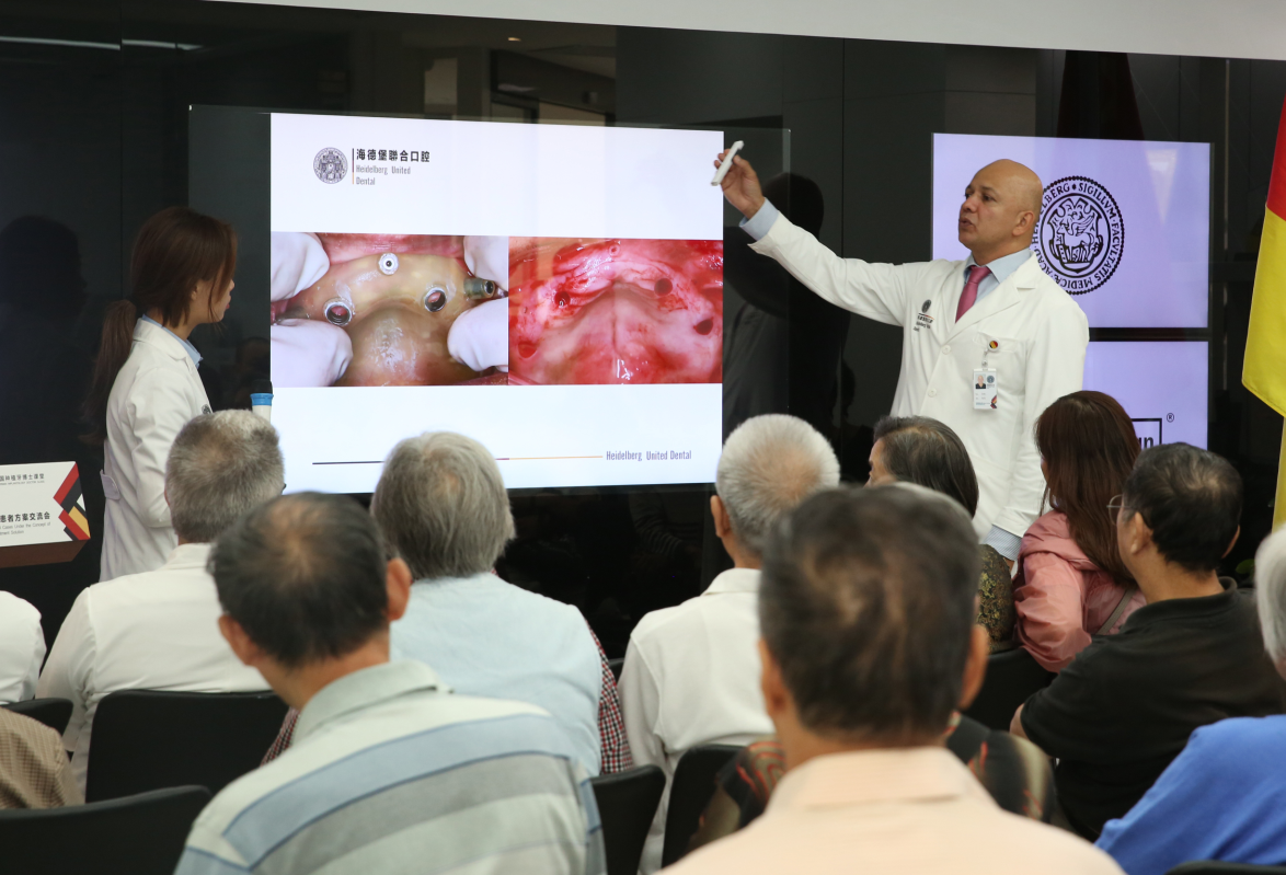 图注:路易斯博士为现场缺牙老人讲解“极简种植牙”智能种植原理