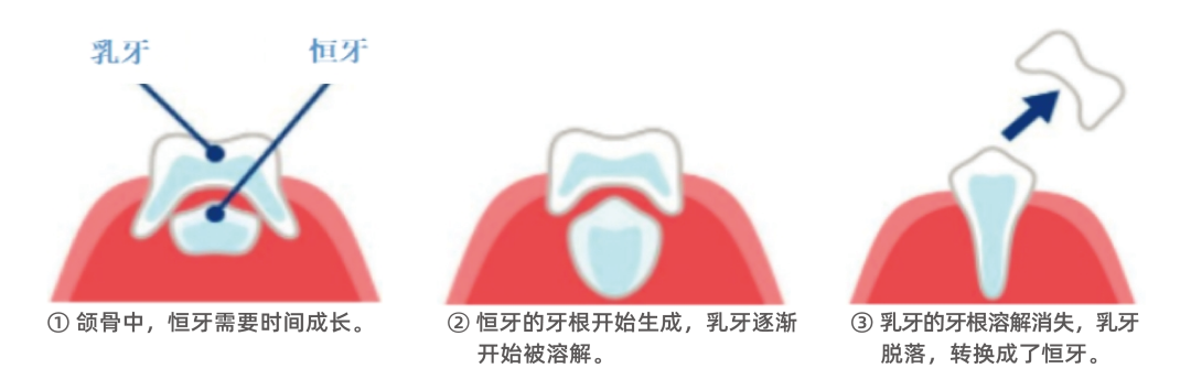 而孩子在小的时候,颌骨窄小,容纳不下恒牙,因此只会长出“小体积”的乳牙;后来随着孩子逐渐长大,咀嚼的食物更多更坚硬后,牙冠短小、硬度不佳的乳牙无法完成这项工作,它就会自动脱落,让坚固的恒牙来替代。