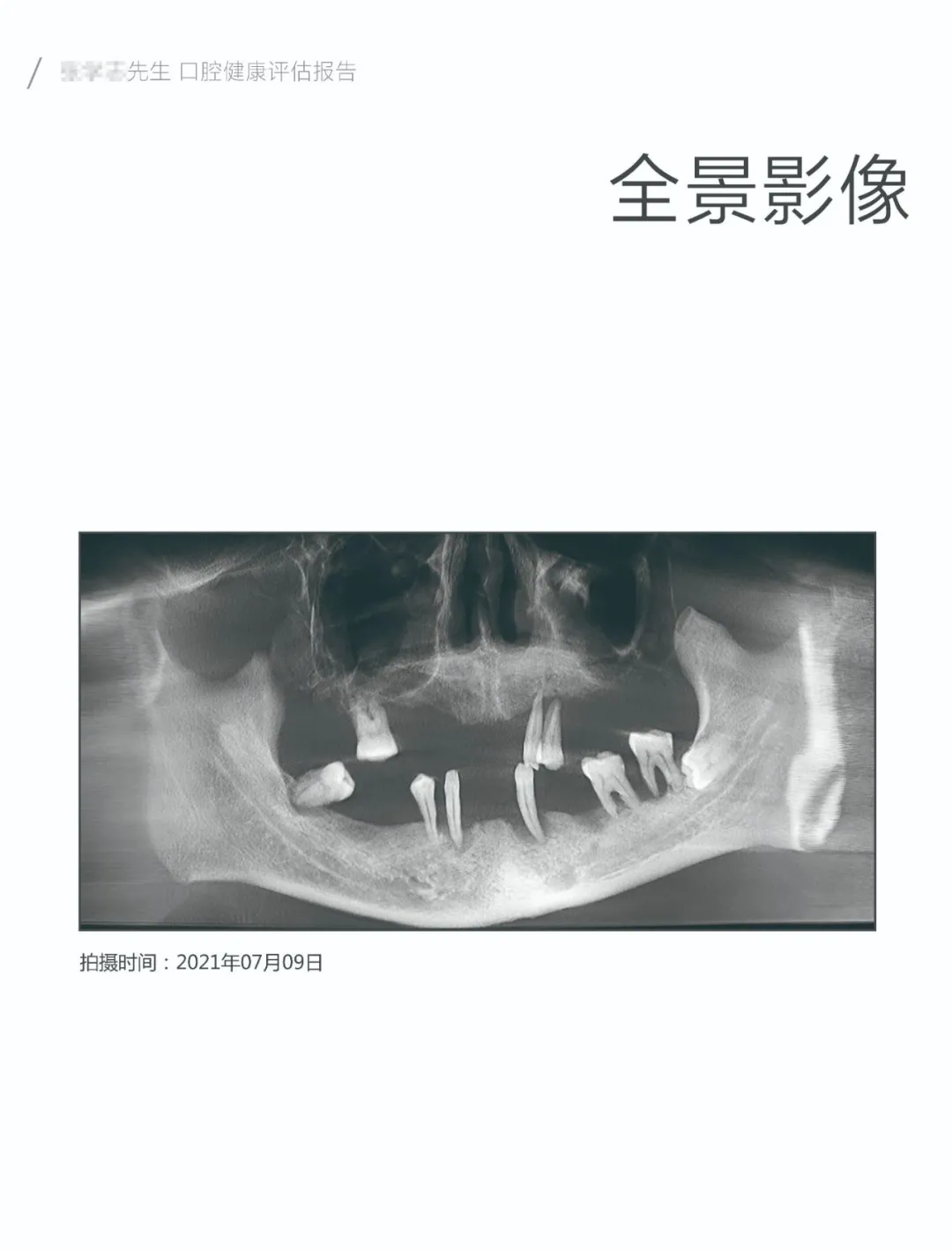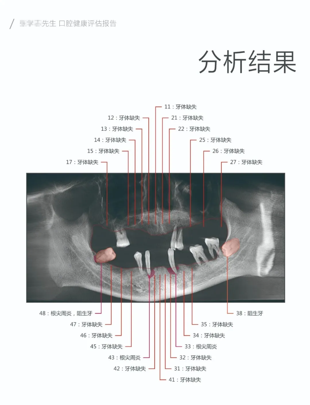 然后是牙齿全景影像图和分析结果标识,哪颗牙缺失了,根尖周炎的位置,能让你比照镜子还要看的清楚自己牙齿的样子。