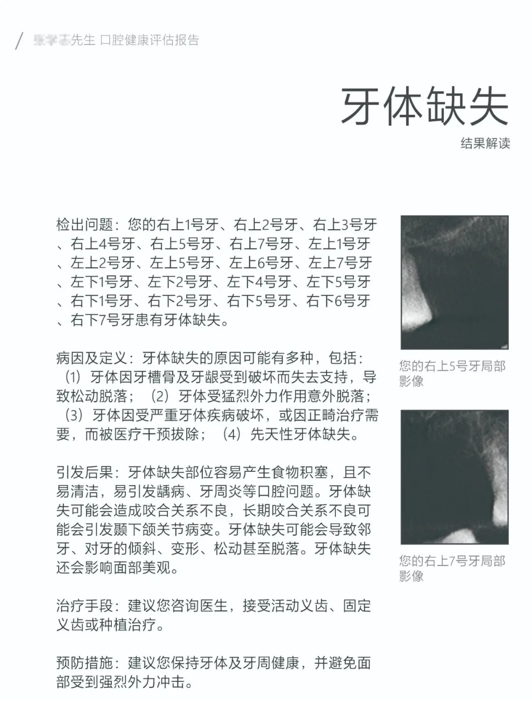 AI报告内还有对牙齿情况、牙周情况、根尖情况检出问题的分析。给出病因,可能引发的后果,相应治疗手段和预防措施。并且还能科普牙齿问题的定义和影像表现。