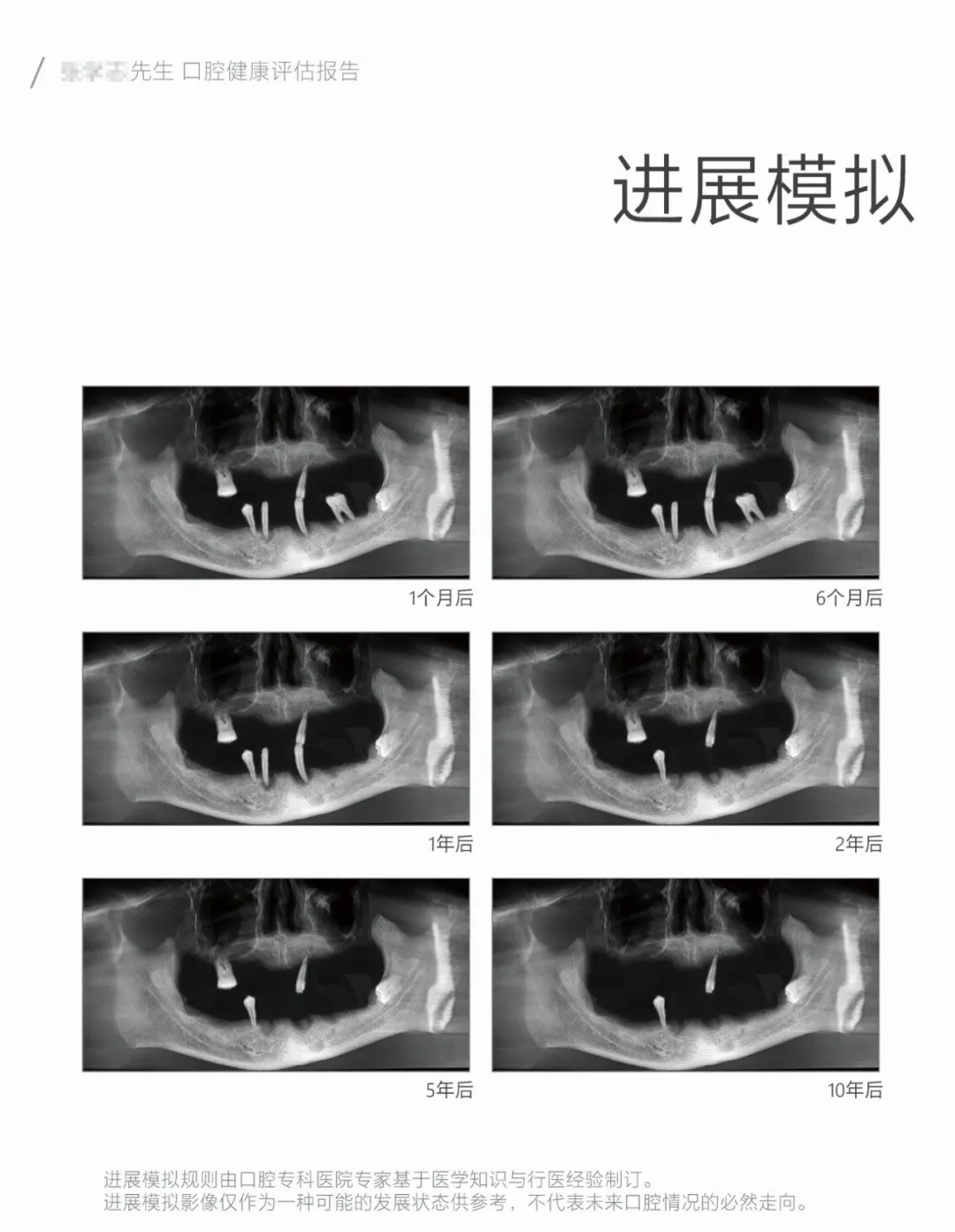 AI报告还可以对口腔问题做出10年期恶化模拟全景图,系统综合口腔医学知识,对每一个阶段可能会产生的问题进行预测和图文描述,让口腔问题的严重性更易于理解。