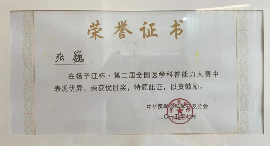 在2015年,张巍医生代表黑龙江省参加全国医学科普大赛获“十佳科普能手”称号。