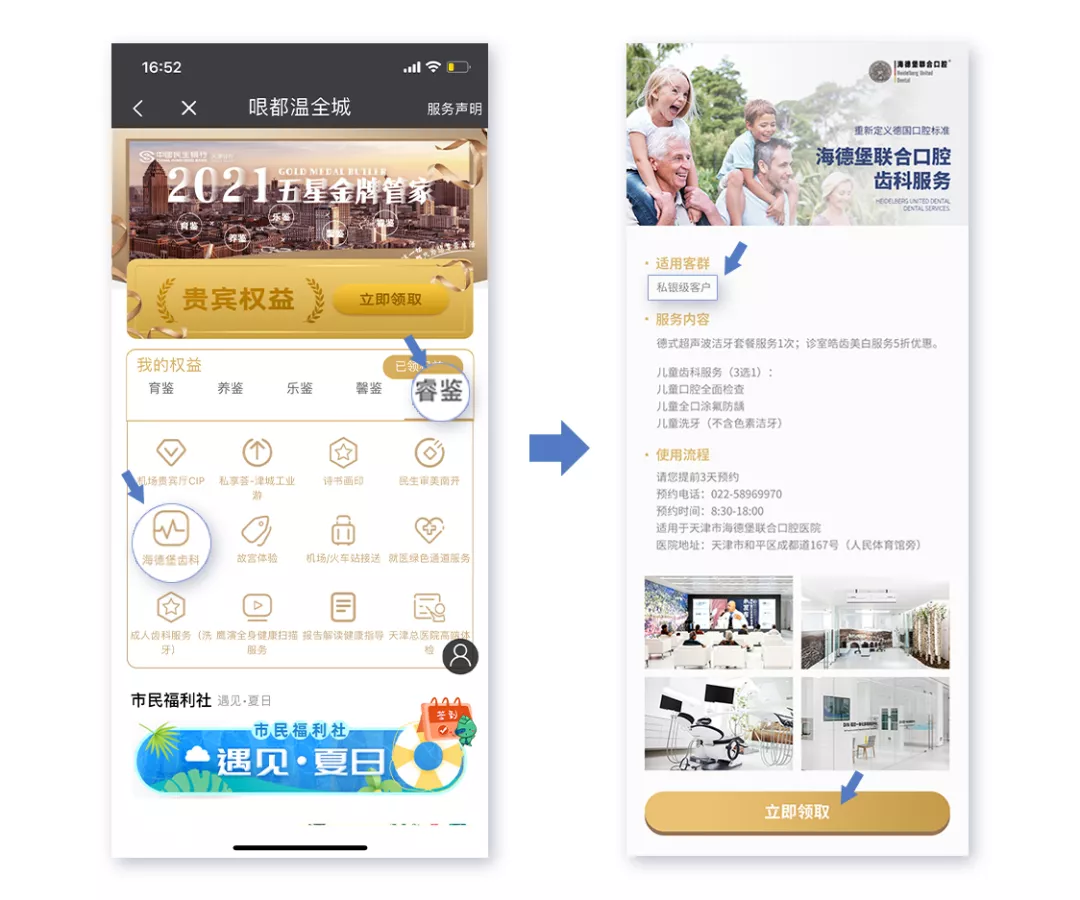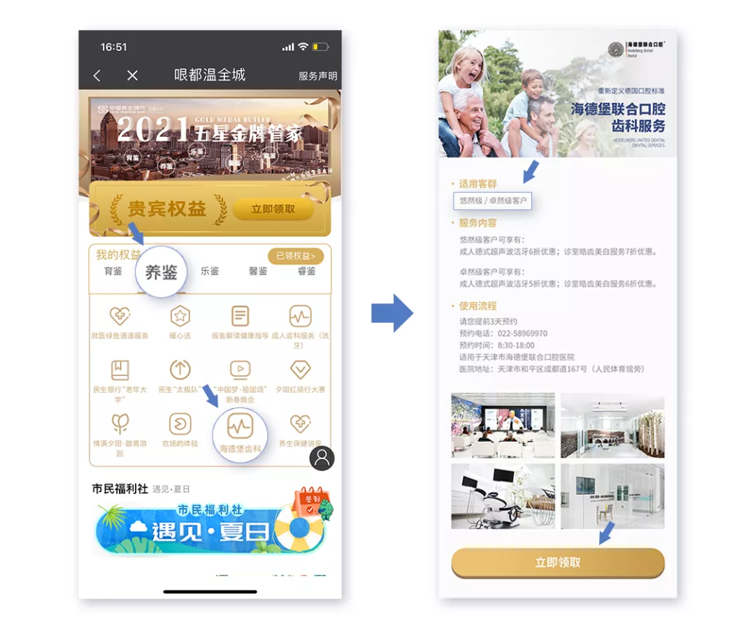 本次活动通过“民生银行手机银行”APP回馈客户。各贵宾级客户可在APP内领取相应海德堡联合口腔提供的诊疗服务。