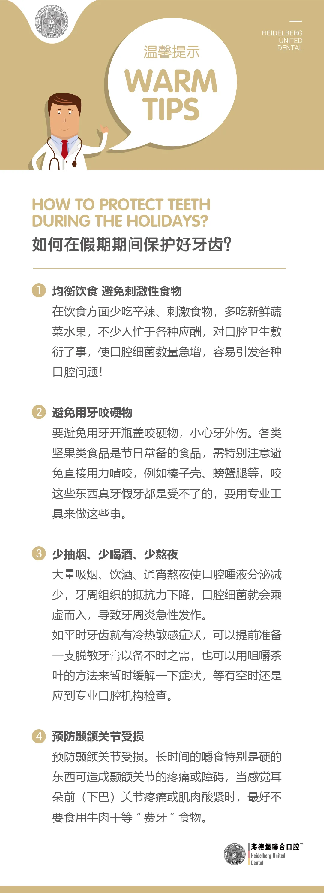 海德堡联合口腔在此提醒您避免由于过度饮食诱发急性口腔疾病,让自信笑容陪伴您度过欢乐假期,十一期间护牙真的很有必要。