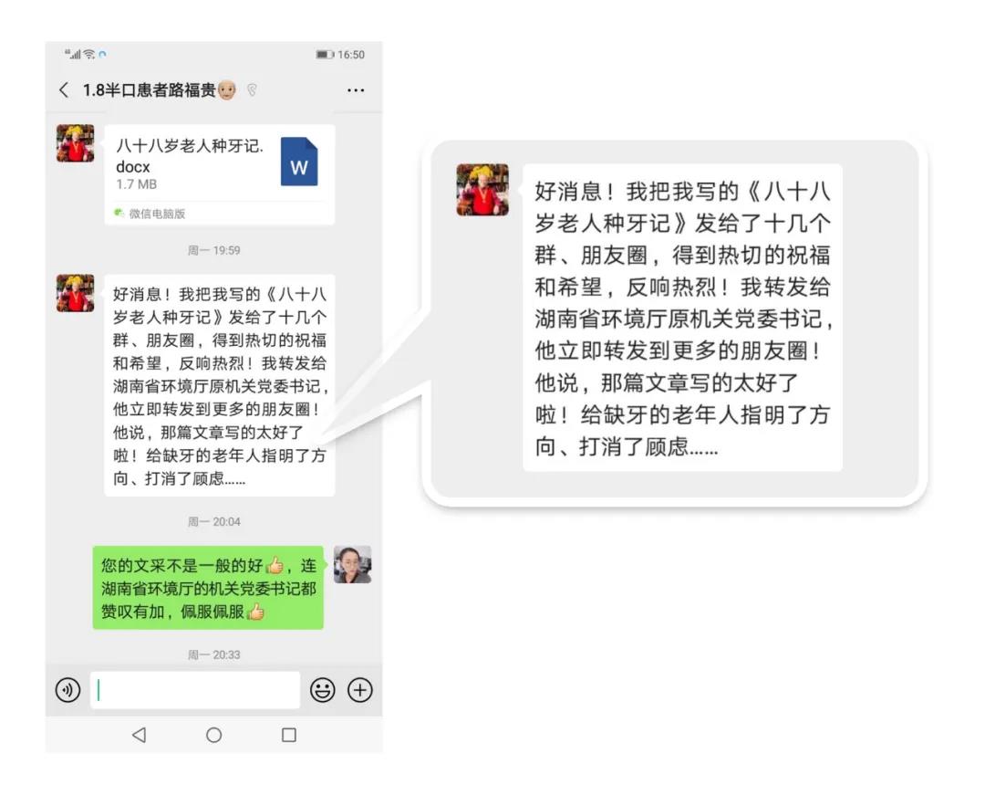 为了表达他对医生的感谢,也为了向更多的中老年朋友分享他自己的种植牙经历,他给我们发来了这篇《八十八岁老人种牙记》,这篇文章在微信朋友圈里转发后,受到欢迎。湖南省生态环境厅原机关党委书记做了转发后,受到热烈欢迎。