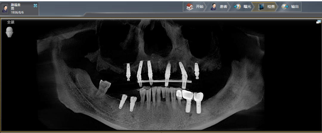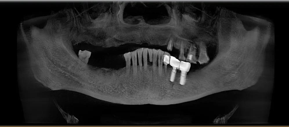 那时候因为年龄偏大,加上技术发展没有到,不能在上颌种植满口牙,只能在左下颌种了两颗新牙,正好对着左上颌残存的四颗老牙。
