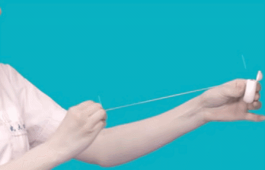 分别缠绕双手的中指,拉紧,用拇指和食指指腹控制牙线。