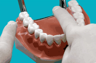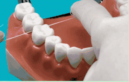 把牙线放在两颗牙齿之间的牙缝,向牙龈方向轻柔地施加压力,左右拉动牙线,使牙线顺利滑入牙间隙。