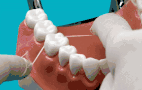 牙线进入牙间隙后分别向口内、口外压紧牙线,左右拉动牙线,轻柔地上下彻底清洁前、后牙齿的邻面,然后向咬合面把牙线提拉出来。
