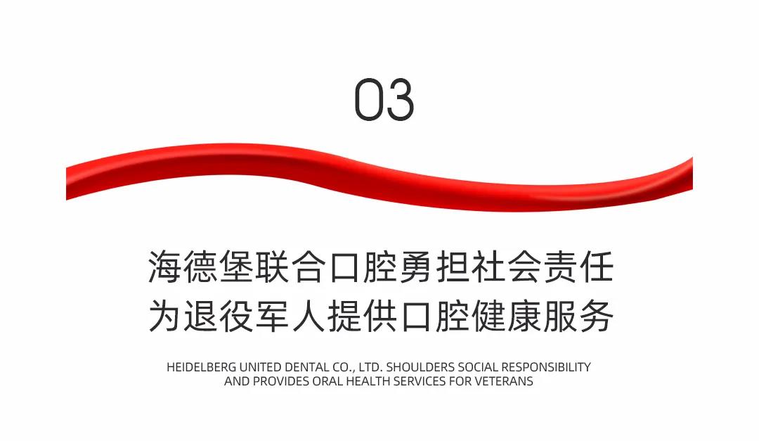 海德堡联合口腔始终坚守严谨的口腔诊疗标准,诚信医疗,积极承担企业社会责任,投身各大公益事业,作为退役军人定点医疗机构,将为退役军人提供优质的医疗服务,并不断提升医疗品质和技术创新守护退役军人们的口腔健康。