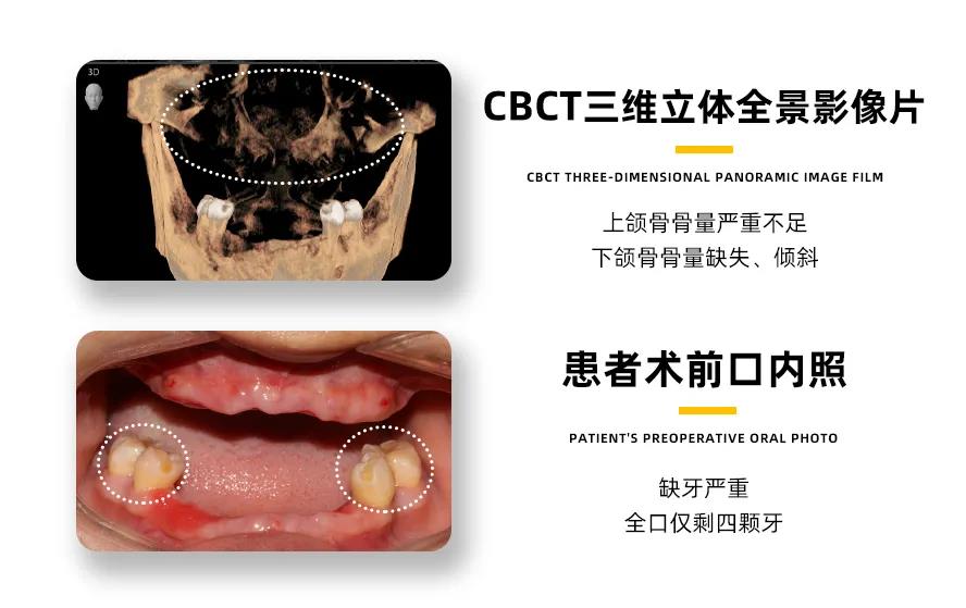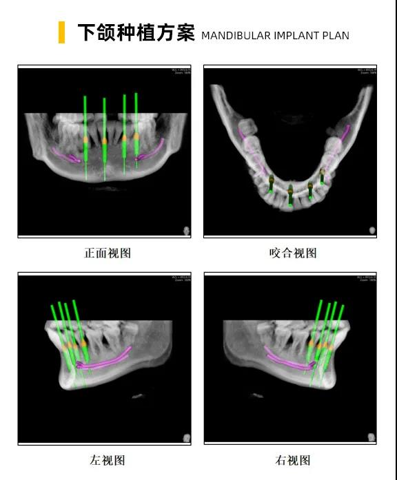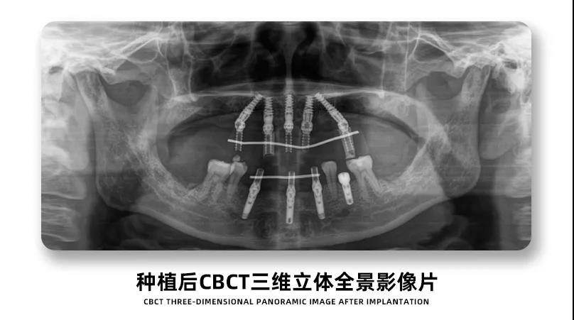 李雪松院长针对她的牙齿情况、牙槽骨的情况设计出一套数字化微创种植方案,拔除口腔余留三度松动牙齿,上下六枚种植体,即刻修复当天就戴上了牙。