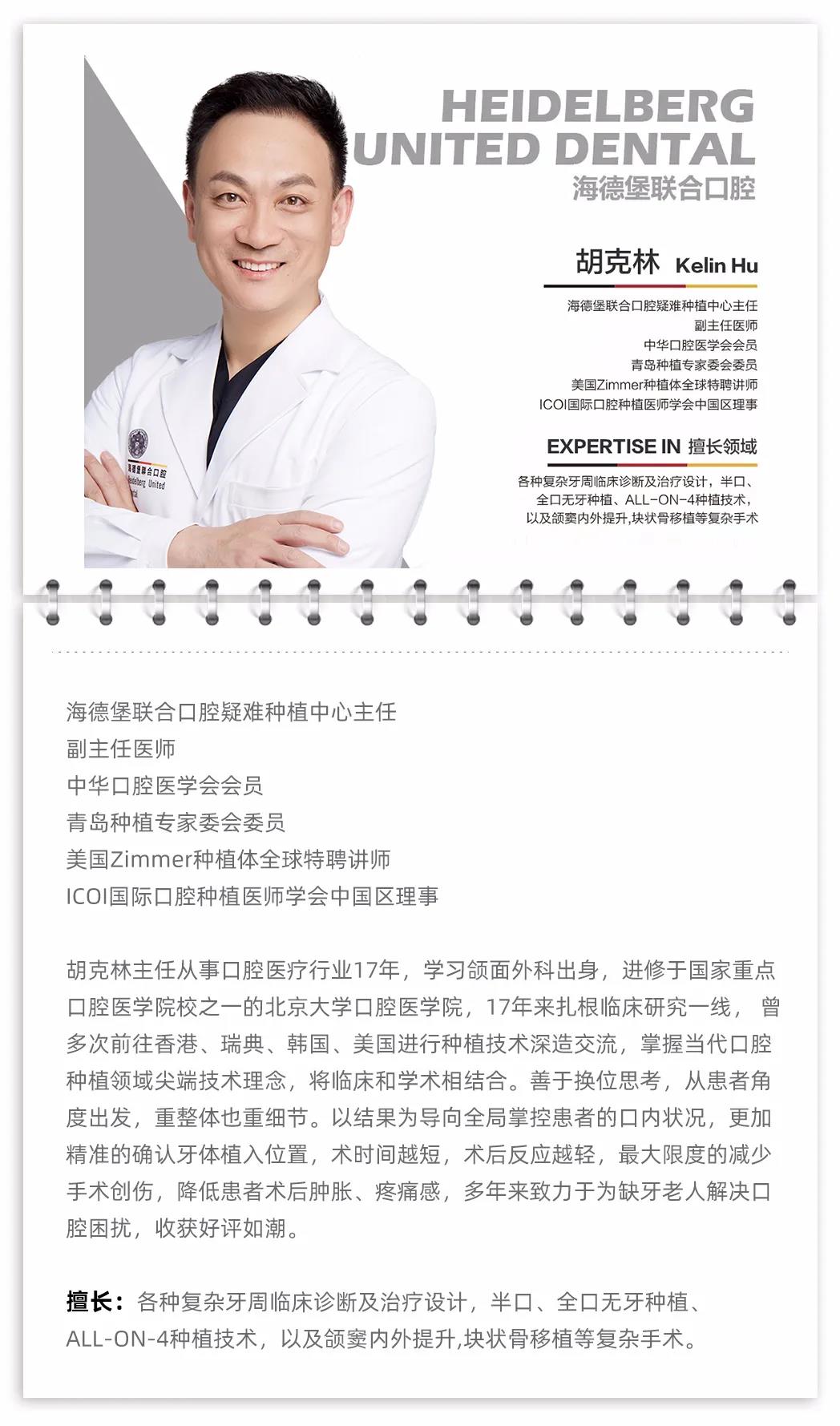 从业口腔医疗行业17年来,海德堡联合口腔疑难种植中心胡克林主任累计种植数量超2万颗,all-on种植病例累计400例,作为国内最早一批系统研究种植牙的医生,他的种植案例数量也是最多的。